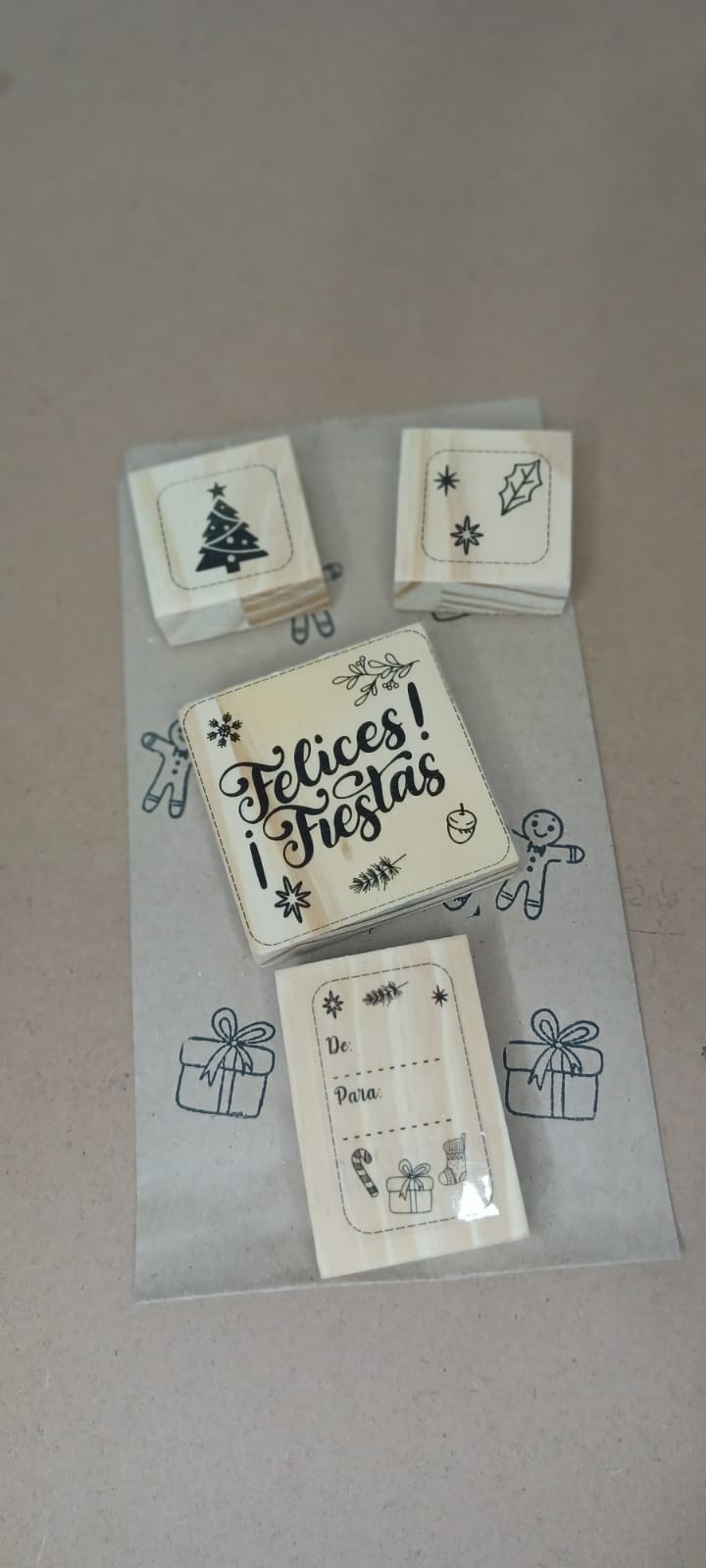 • 🏷️ 1 Sello 6x6 cm – “Felices Fiestas”